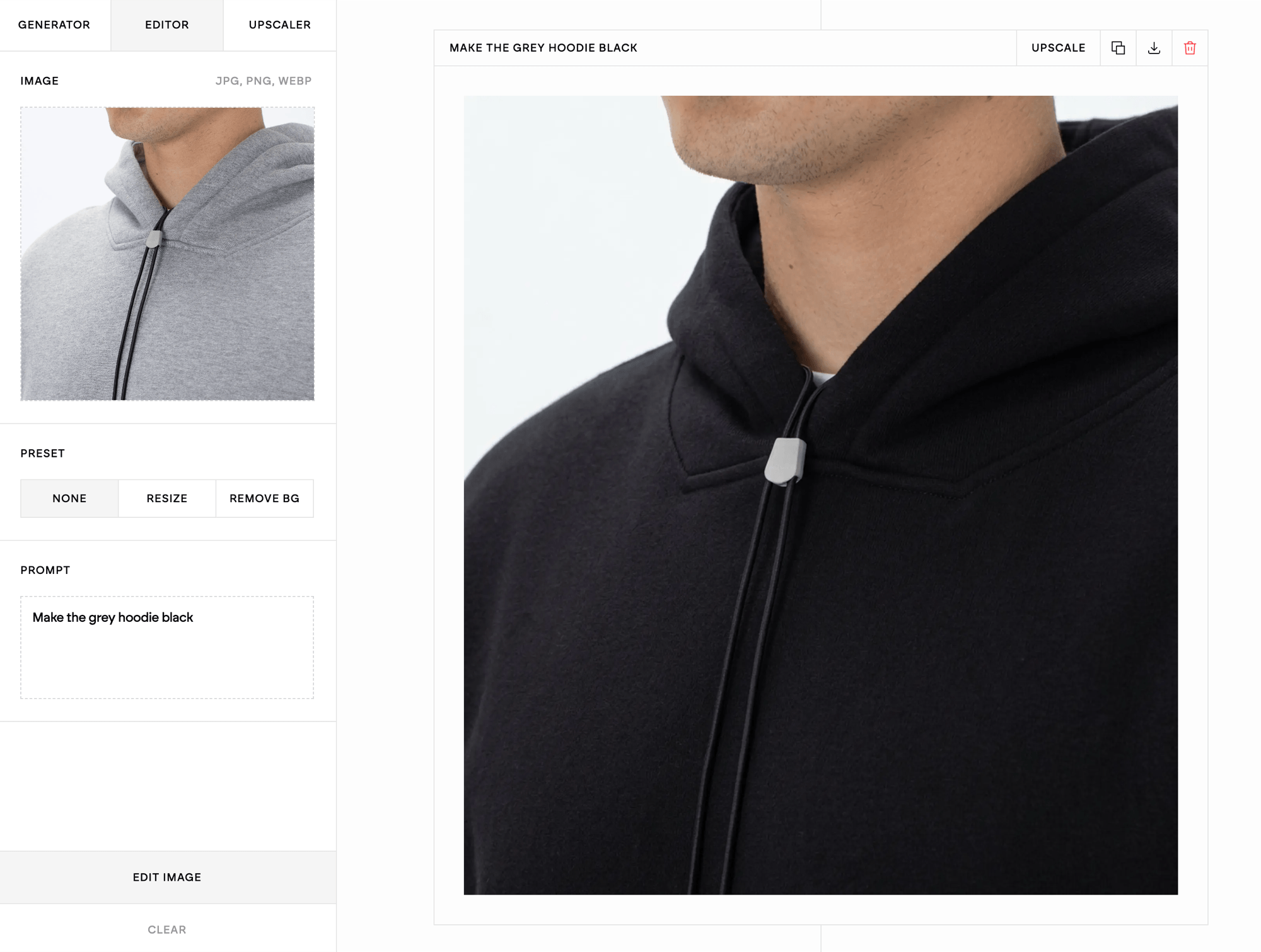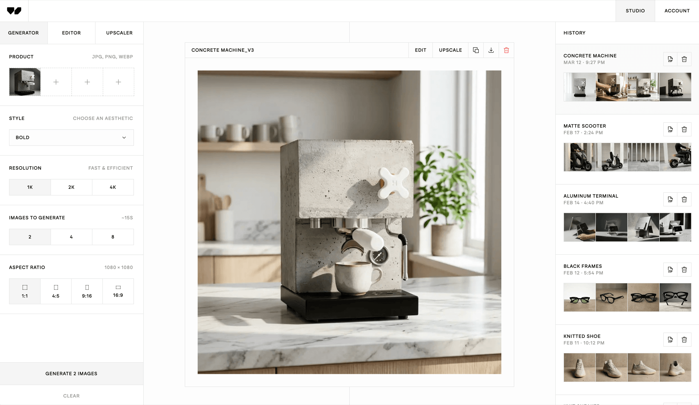 Get a diverse set of studio-quality visuals in seconds. Edit, upscale, download. All in one place.